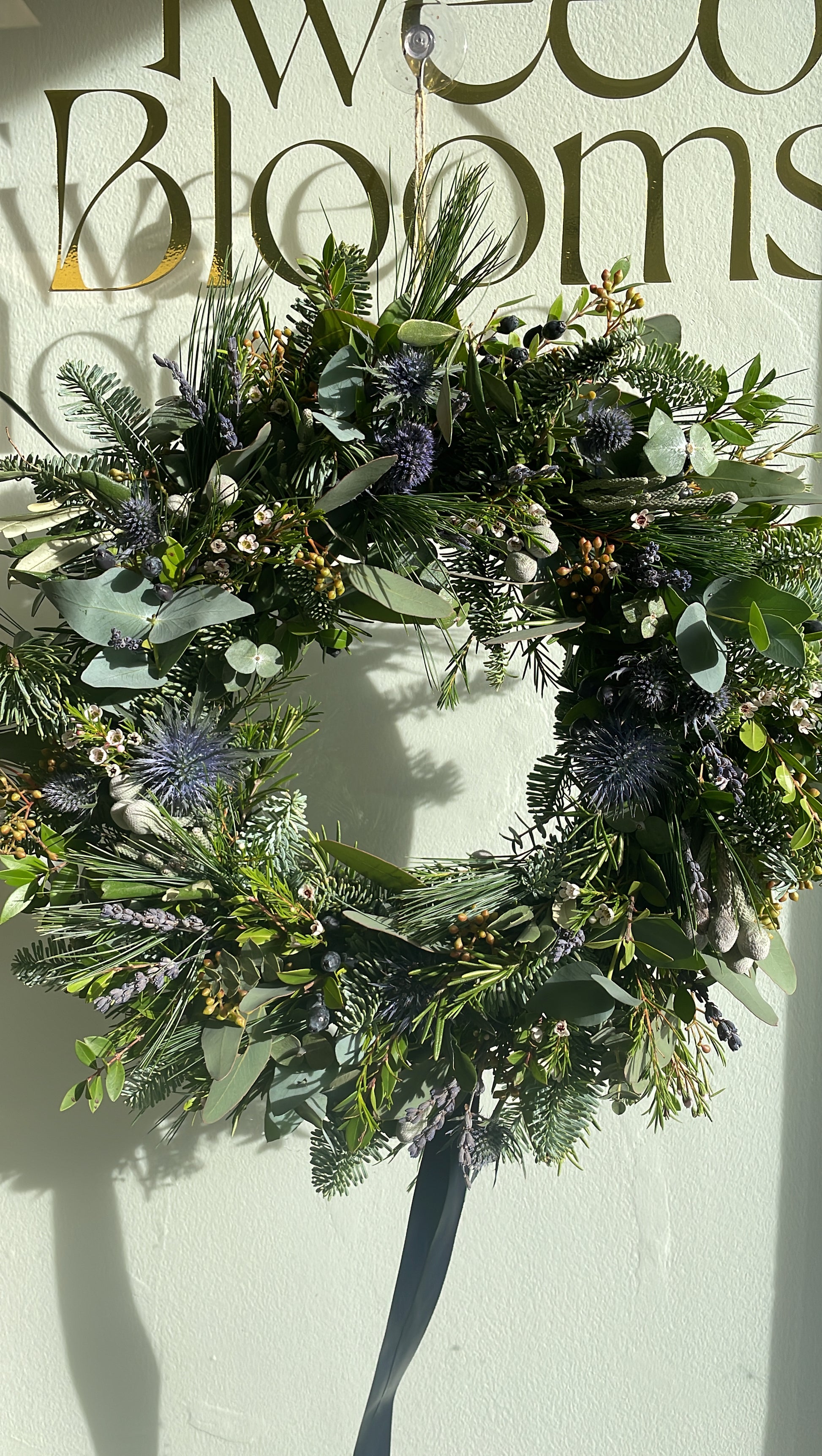Introduce a touch of refined winter elegance to your holiday décor with our Tweed Blooms Special: Blue Eryngium Christmas Wreath. This artisan-crafted wreath features striking blue eryngium blooms nestled within a framework of lush evergreen foliage, eucalyptus, with fragrant lavender sprigs accented with silver highlights, and seasonal textures for a sophisticated, modern holiday look.